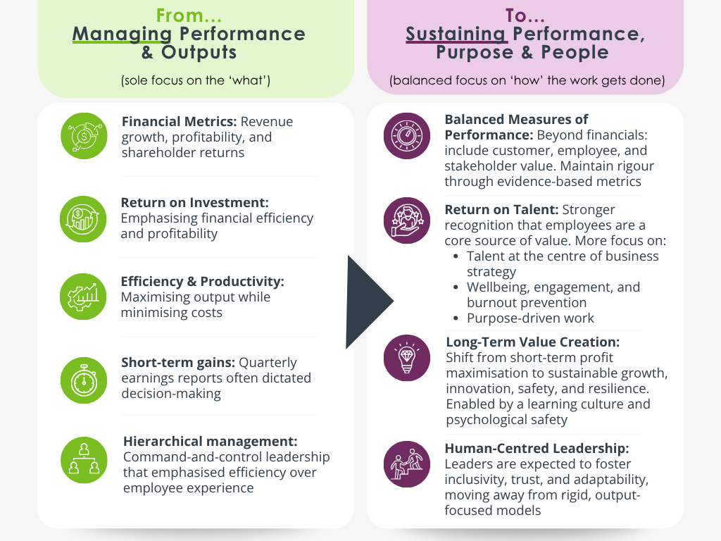 Progressive businesses are increasingly recognising sustainable high-performance requires a broader perspective – one that integrates people, purpose, and process alongside profit. Organisations need to make choices about where they focus their efforts to articulate and deliver what sustainable high-performance means for them.