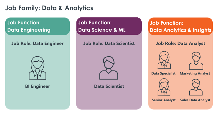 The below graphic gives an example of how a Job Architecture could be applied to the people data shown above. The roles with Data & Analytics skills, otherwise spread across the organisation, are mapped to Job Roles all within the Data & Analytics job family.