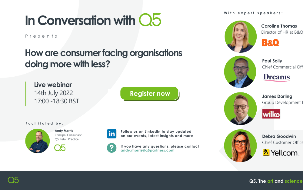 Q5’s Andy Morris was joined by expert speakers Caroline Thomas, Director of HR at B&Q, James Dorling, Group Development Director at Wilko, Paul Solly, Chief Commercial Officer at Dreams and Debra Goodwin, Chief Customer Officer at Yell.