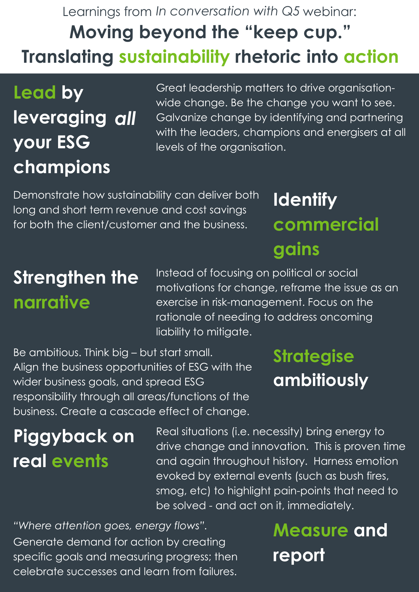 Shifting ESG regulations, rising capital costs, tighter labor supply and depleting natural resources are exacerbating the strain; but does this have to be the case?  Listen below to explore the key blockers that prevent organisations from seeing sustainability as a value creation opportunity and share key learnings from those that are doing it best in Australia.