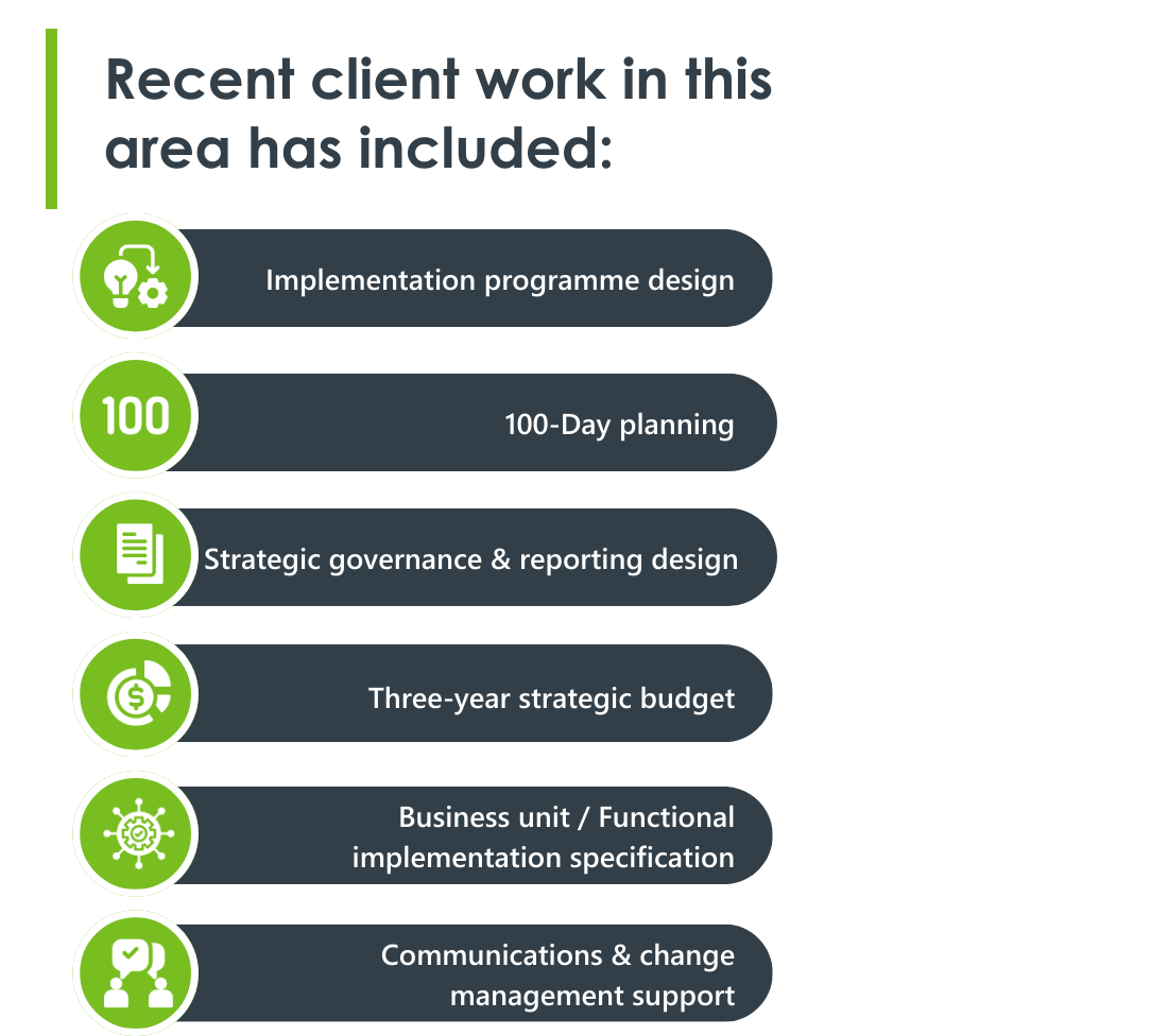 It’s important that people are accountable for the strategy, have visibility of what’s expected and when, and that owners feel supported to drive progress – even when it’s alongside Business As Usual. We help you execute your strategy with a plan that tracks and measures progress, establishes governance to drive progress, and supports owners in realising the vision.